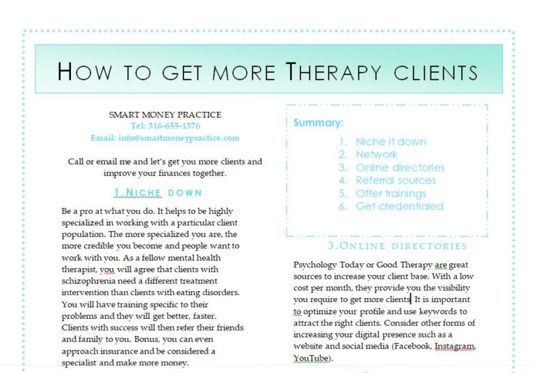 This article contains six practical methods to start getting clients today as a mental health therapists. Click the link below to download it. After reading this, you should be able to get your several clients. If you need help in implementing these methods, Just write me an email and we will do it together. Download it now